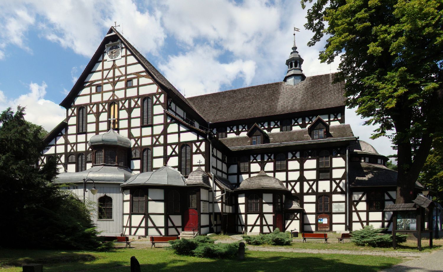 Kościół Pokoju zawsze robi wrażenie tym, że z zewnątrz wygląda niemal niepozornie, a w środku eksploduje bogactwem detalu. Drewniane, skrzypiące galerie i zapach starego drewna tworzą atmosferę, która bardziej przypomina teatr niż świątynię. Wnętrze jest pełne malowideł, złoconych dekoracji i herbów – można długo chodzić po prostu od balkonu do balkonu, wypatrując kolejnych szczegółów. To jedno z tych miejsc, gdzie historia nie jest podana w muzealnej gablocie, tylko wisi nad głową i otacza ze wszystkich stron. Nawet krótka wizyta zostawia w głowie obraz barokowego przepychu w drewnianej „skrzynce” na uboczu miasta.